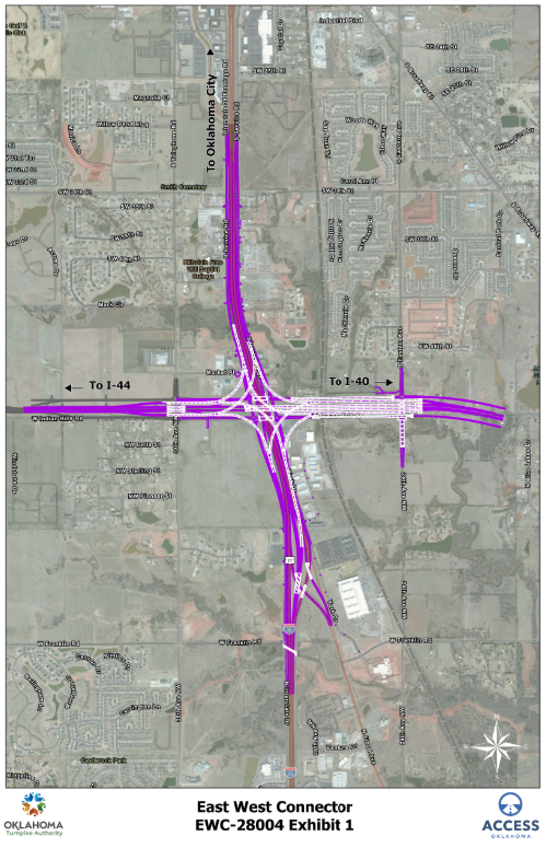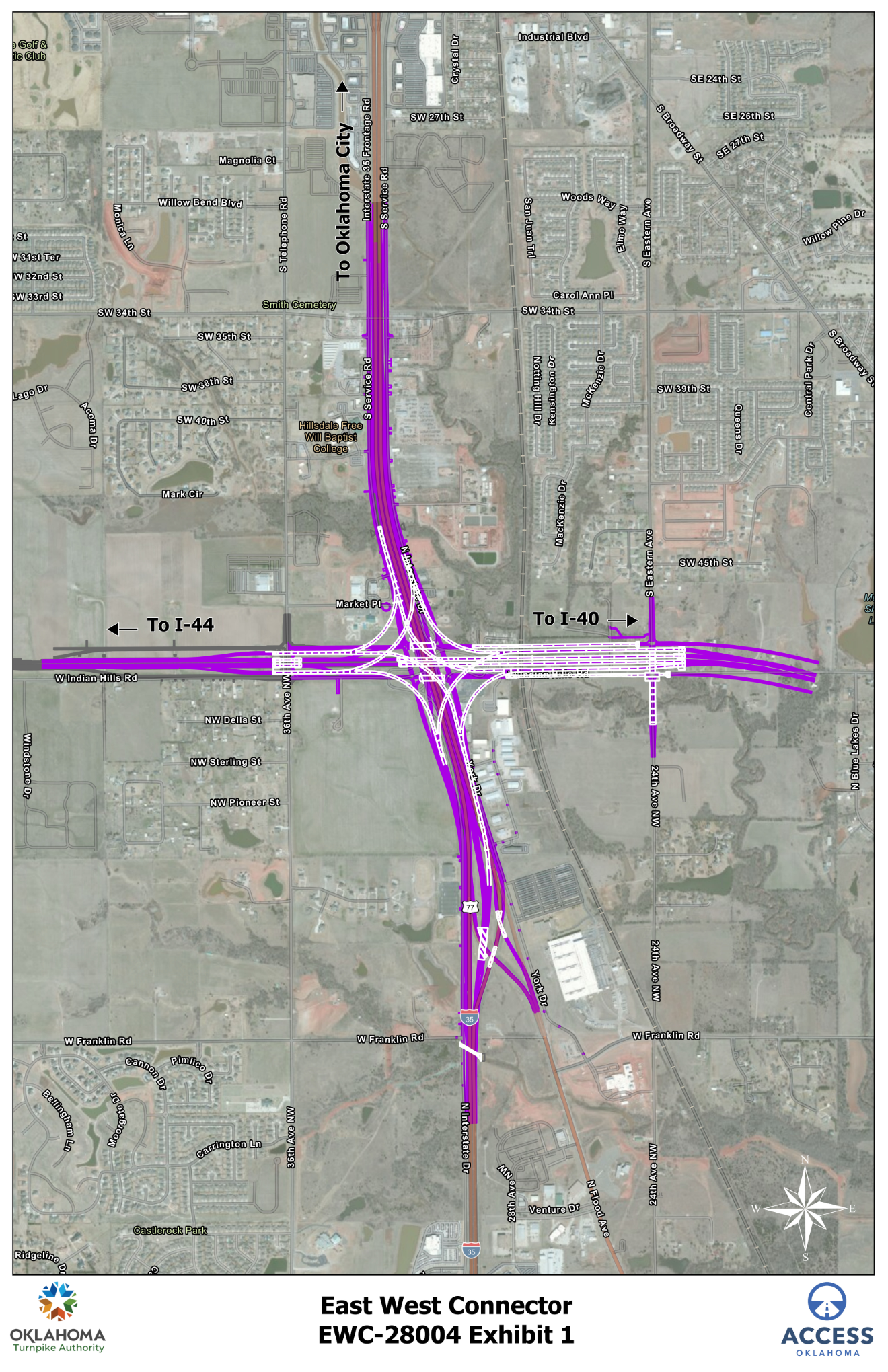 This exhibit shows the East-West Connector and I-35 Interchange after all construction is completed. The interchange will be constructed in phases, called “Work Packages”. The first Work Package will provide the basic connection from the EWC to I-35 and will continue ODOT’s plan to make the I-35 Service Roads one-way. Future work packages will extend the EWC to the east and west along with one-way frontage roads. The interchange with I-35 will include direct connection ramps for all movements. Please view the videos below for more explanation of the first Work Package and the ultimate future interchange. Construction phasing for later work packages will be determined as engineering design work progresses.