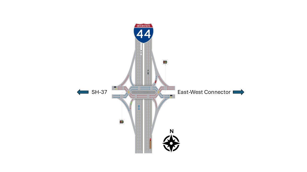 This exhibit shows the East-West Connector and I-44 Interchange after all construction is completed. The interchange will be constructed in phases, called “Work Packages." Please view the videos below for more explanation on how the interchange will be constructed and how you will use it.
